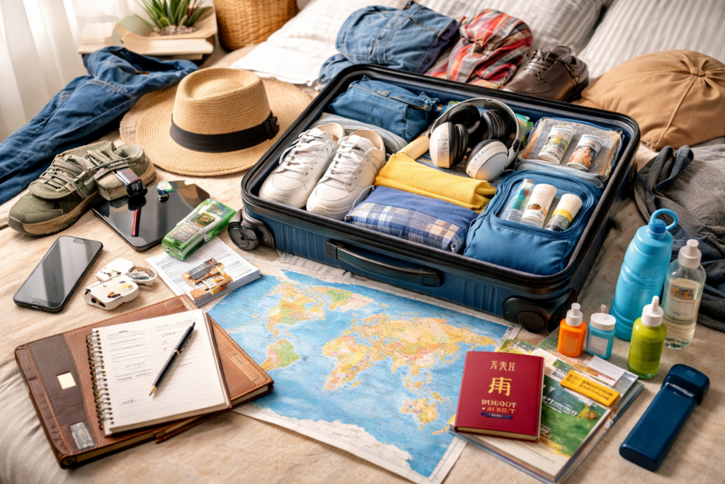 衣類は持ちすぎ注意です。最初の数日分と季節に合う服があれば十分で、足りない分は現地で買い足せます。薄手の羽織りが一枚あると便利です。